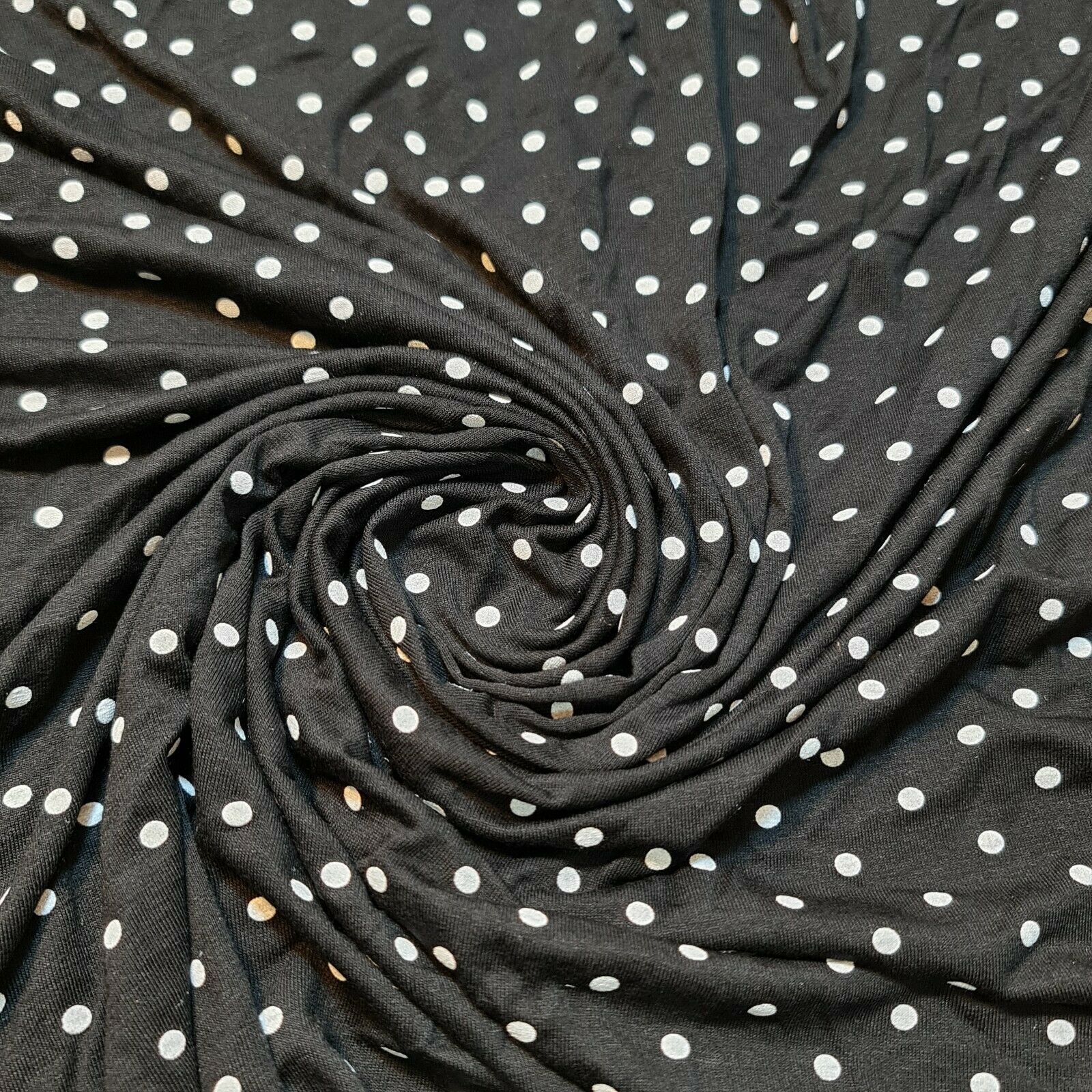 Black Polka Dot ITY Lycra Fabric. Featuring classic white polka dots on a black background, this fabric offers a timeless look with a modern stretch, making it ideal for dressmaking, dancewear, costumes, crafts, and performance outfits.