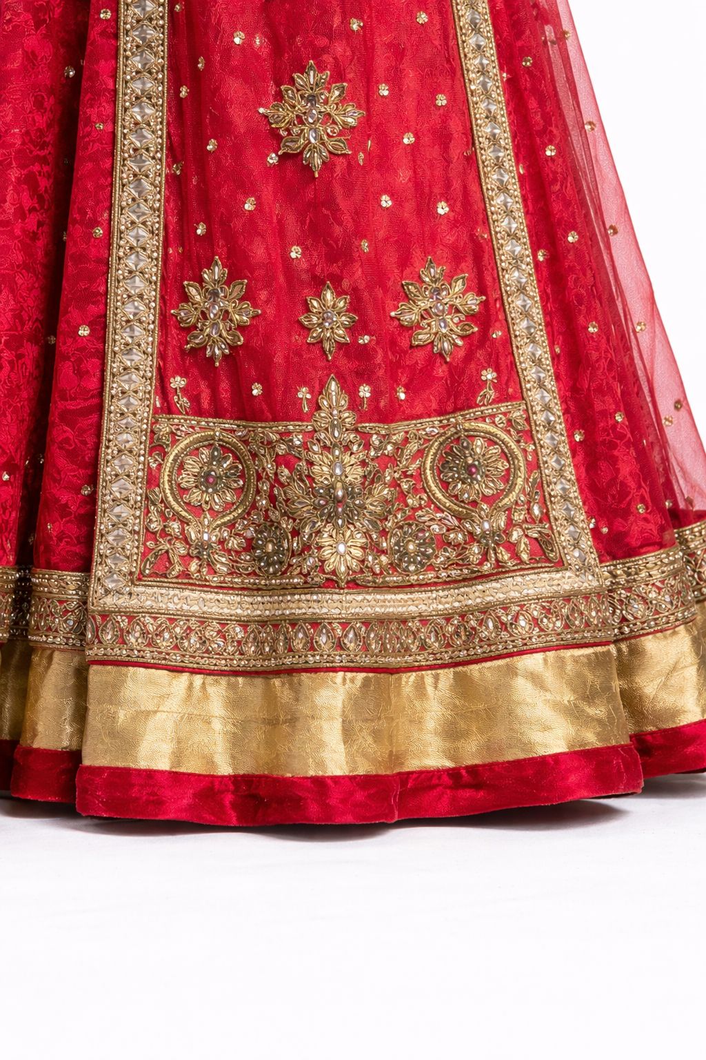 Paired with a sheer red net dupatta featuring delicate embellishments and a bold gold border, this outfit perfectly balances grandeur and grace.
