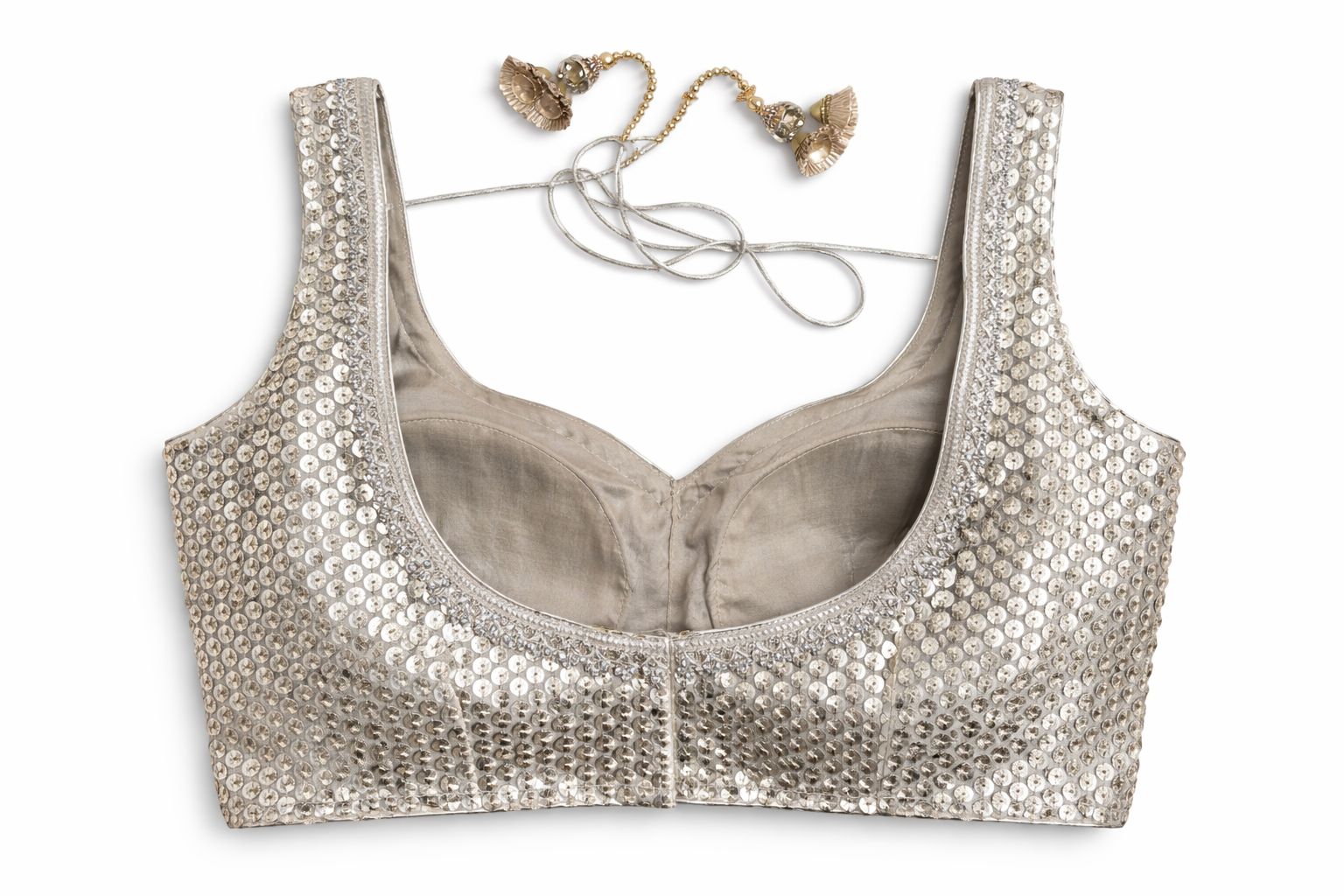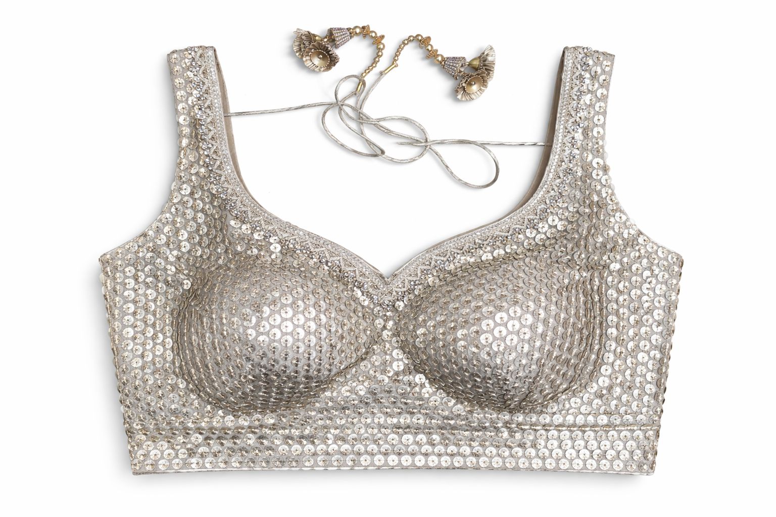 The classic deep neckline enhances the silhouette, while the broad shoulder straps provide comfort and support. Intricate sequin embroidery throughout creates a rich, high-shine finish, making it a perfect match for bridal lehengas, reception sarees, cocktail outfits, and festive ensembles.