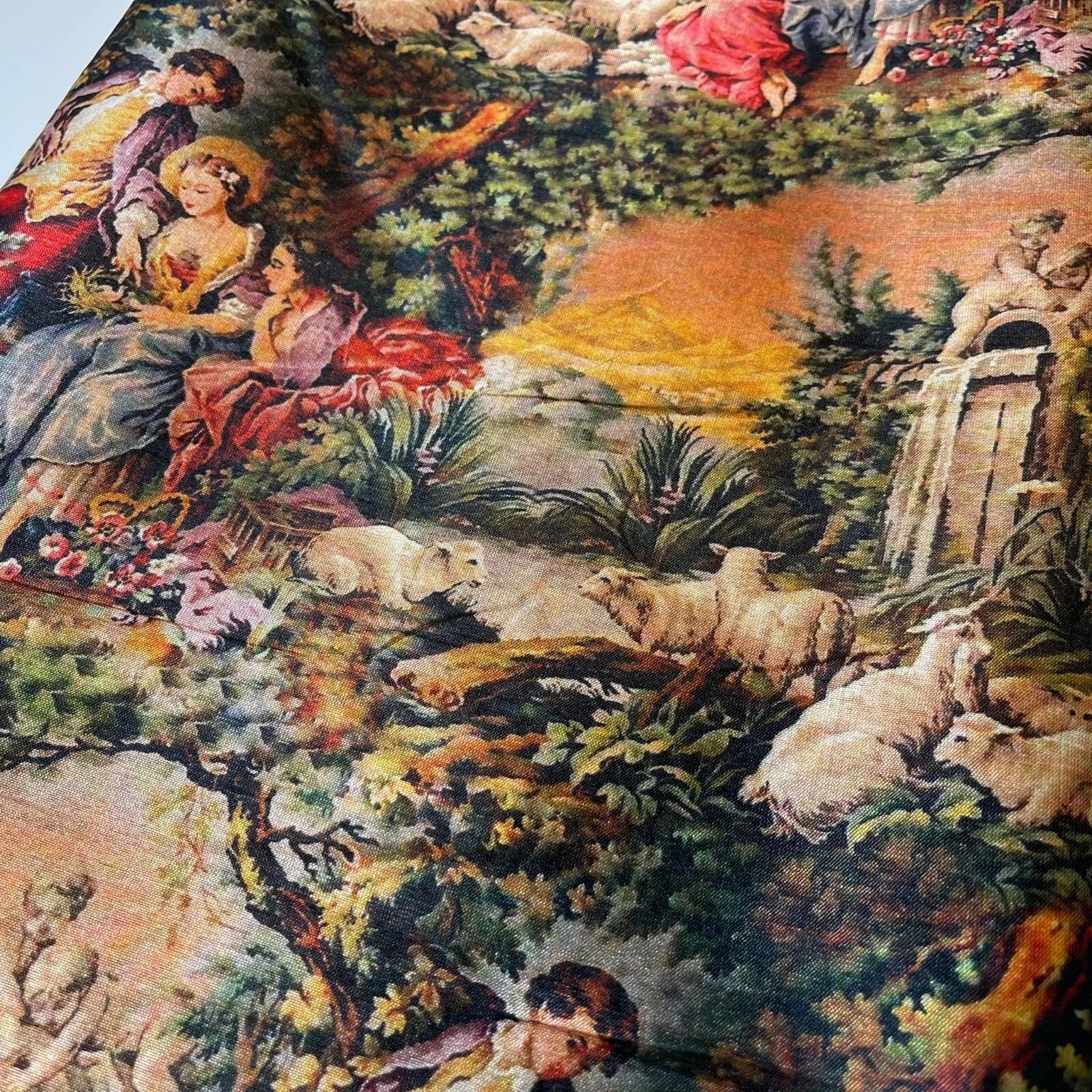 French Tapestry Floral Polyester Raw Silk Fabric. Inspired by classic French tapestry patterns, this fabric features rich floral detailing that adds sophistication and artistic charm to fashion and creative sewing projects.