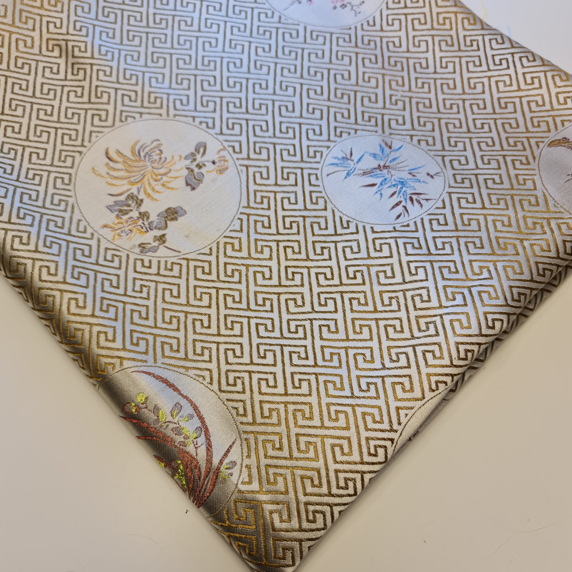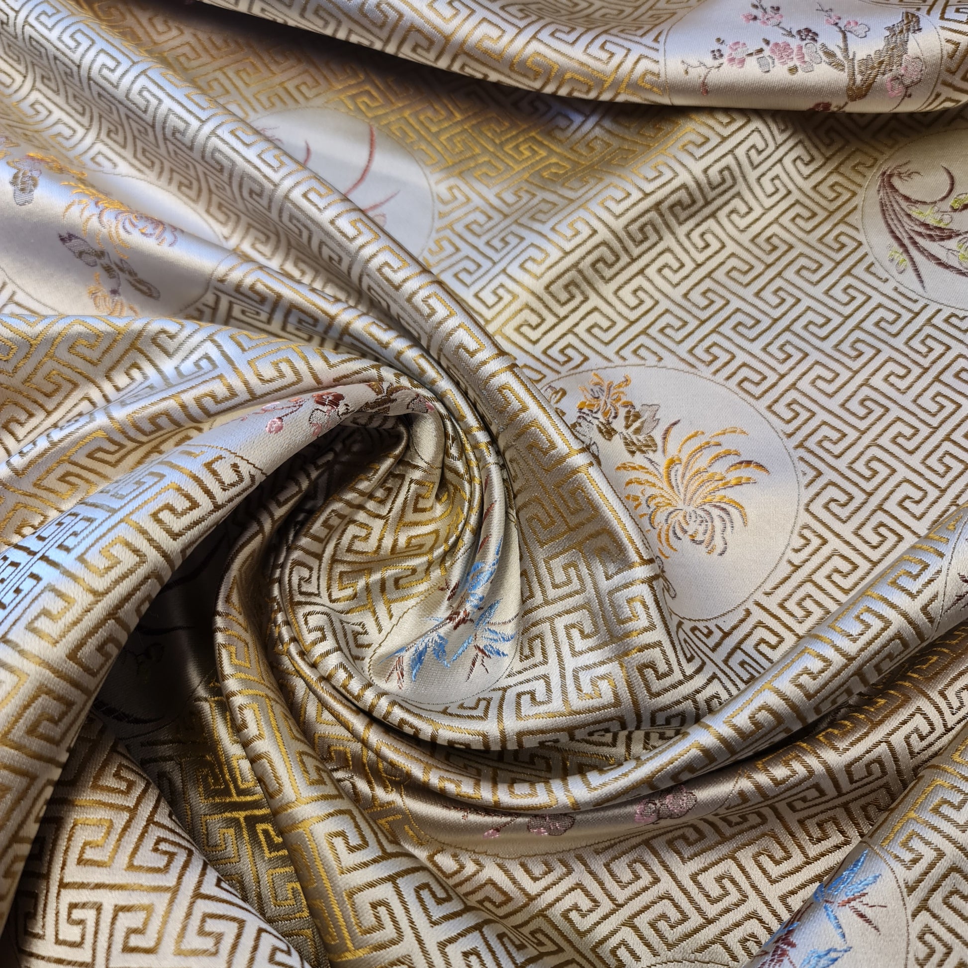 Elegant ivory satin jacquard fabric featuring a delicate floral woven pattern, perfect for dresses, costumes, craft projects, and fashion designs. This premium fabric combines a luxurious satin sheen with textured jacquard detailing for a sophisticated, high-end look.