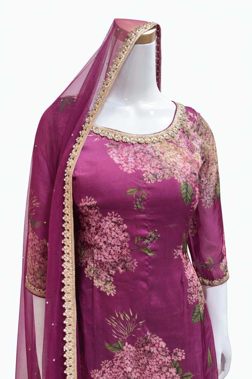 Magenta Floral Georgette Satin Suit with Printed Patiala Salwar Bottom & Net Dupatta – Festive & Party Wear