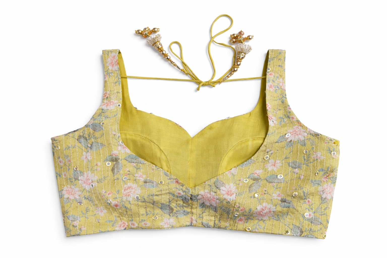 Brighten up your ethnic wardrobe with this charming Mustard Yellow Floral Designer Blouse, perfect for festive gatherings and summer celebrations. Crafted in a refreshing mustard base, this blouse features delicate pastel floral prints with subtle mirror embellishments that add a soft sparkle.