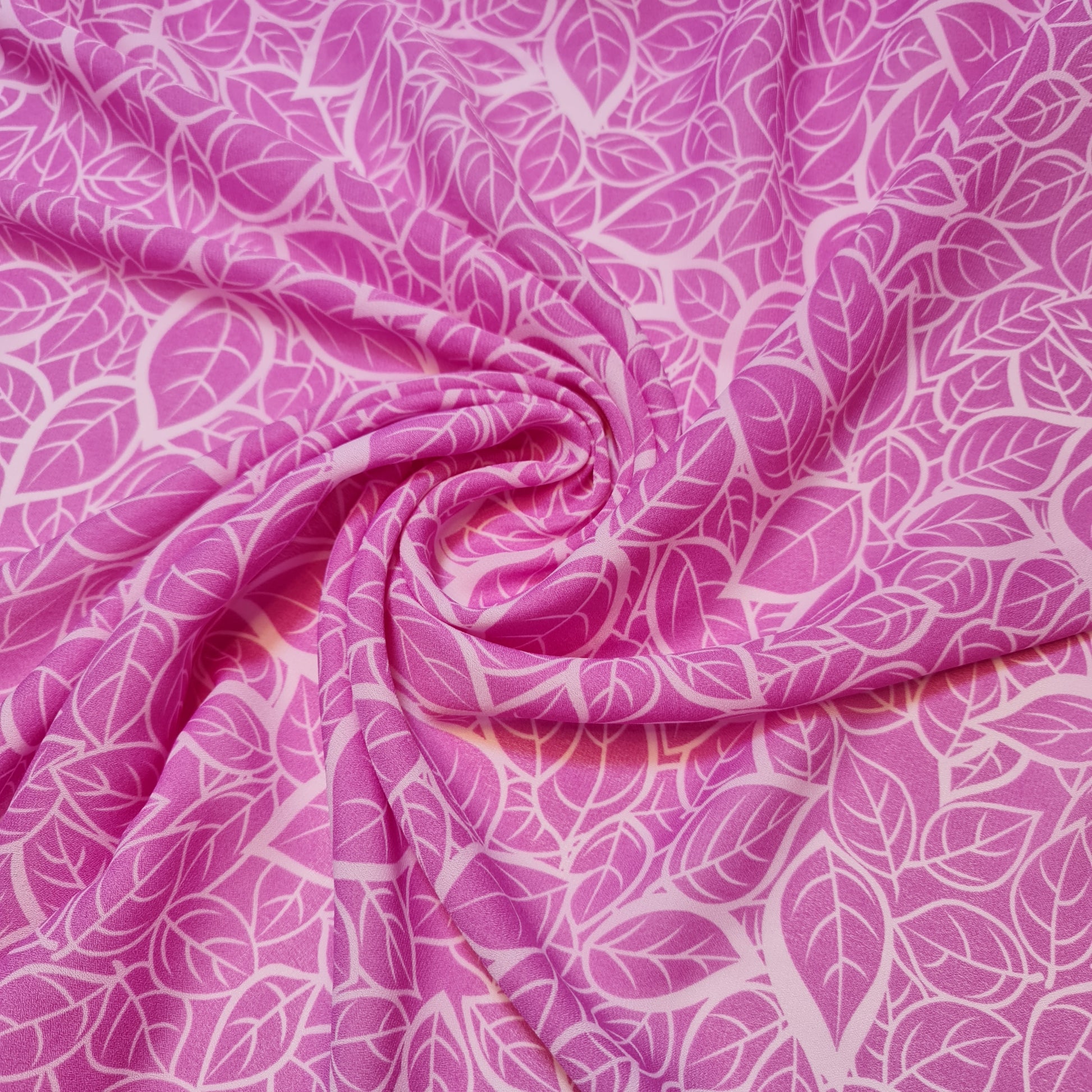 Pink Leaf Crepe Chiffon Fabric. This sheer, lightweight chiffon features a delicate autumn-inspired floral leaf print, perfect for dresses, skirts, scarves, drapes, and craft projects. The soft, flowing texture makes it ideal for stylish draping and layering, giving your garments and décor a sophisticated, airy look.