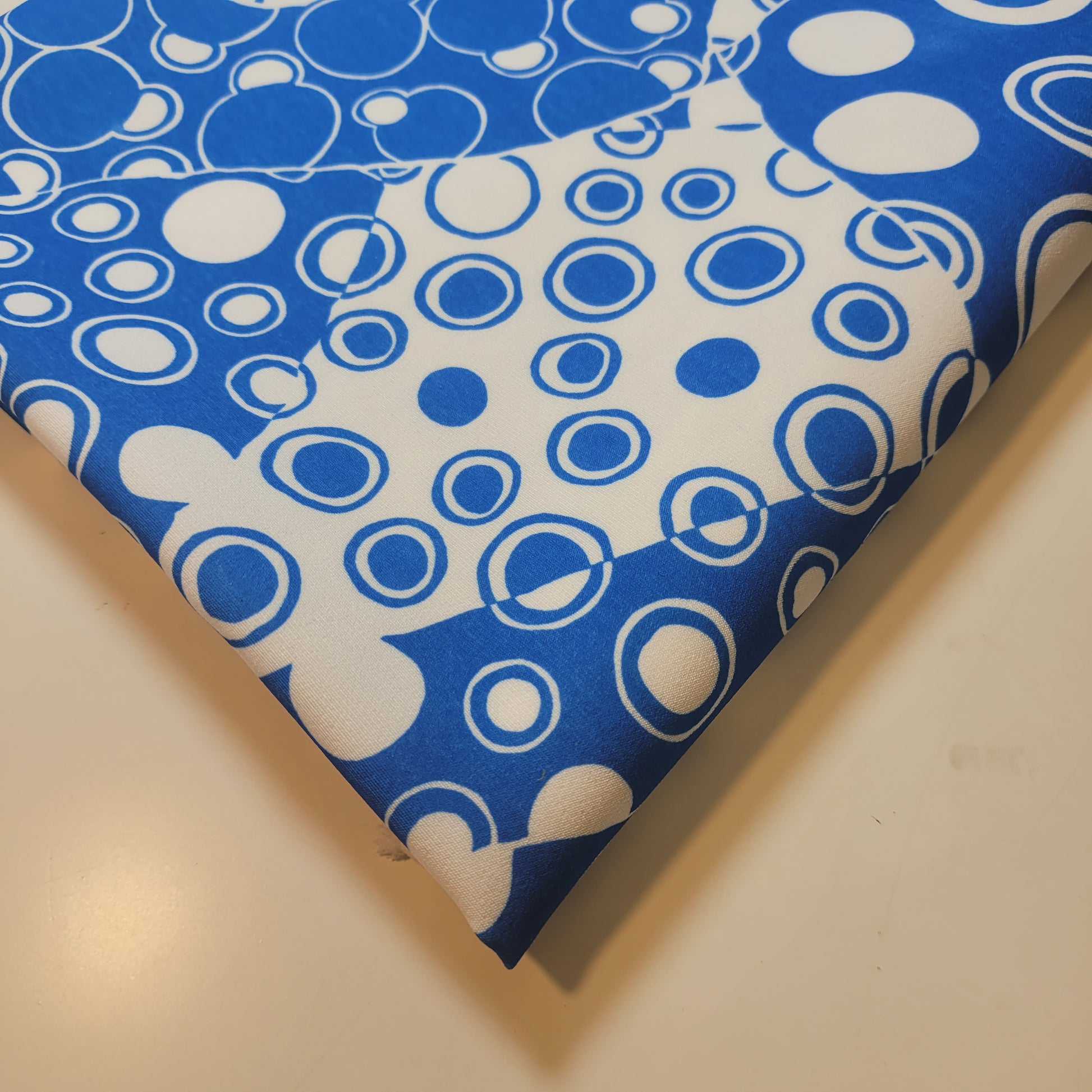 Add a splash of modern flair to your creations with this eye-catching Scuba Crepe fabric, featuring an abstract pattern of white and blue concentric circles in varied sizes and arrangements. This contemporary design offers a playful yet striking aesthetic ideal for both fashion and craft applications.