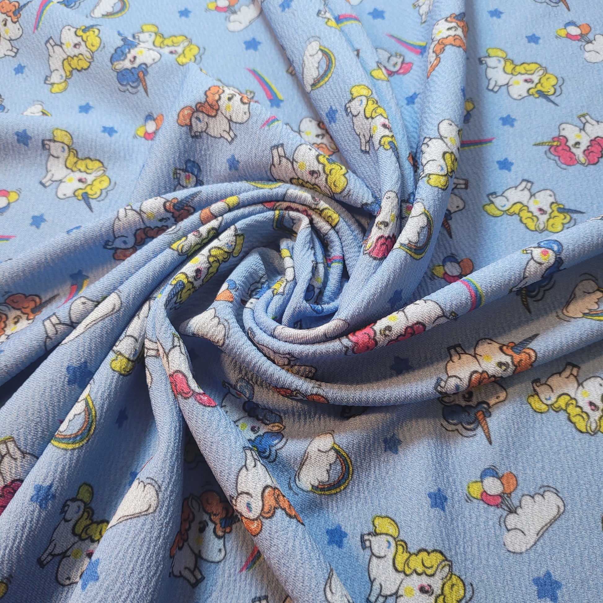 Scuba Crepe Fabric – Cute Cartoon Unicorn Print on Blue | Stretch Fabric by the Meter (58” Wide)