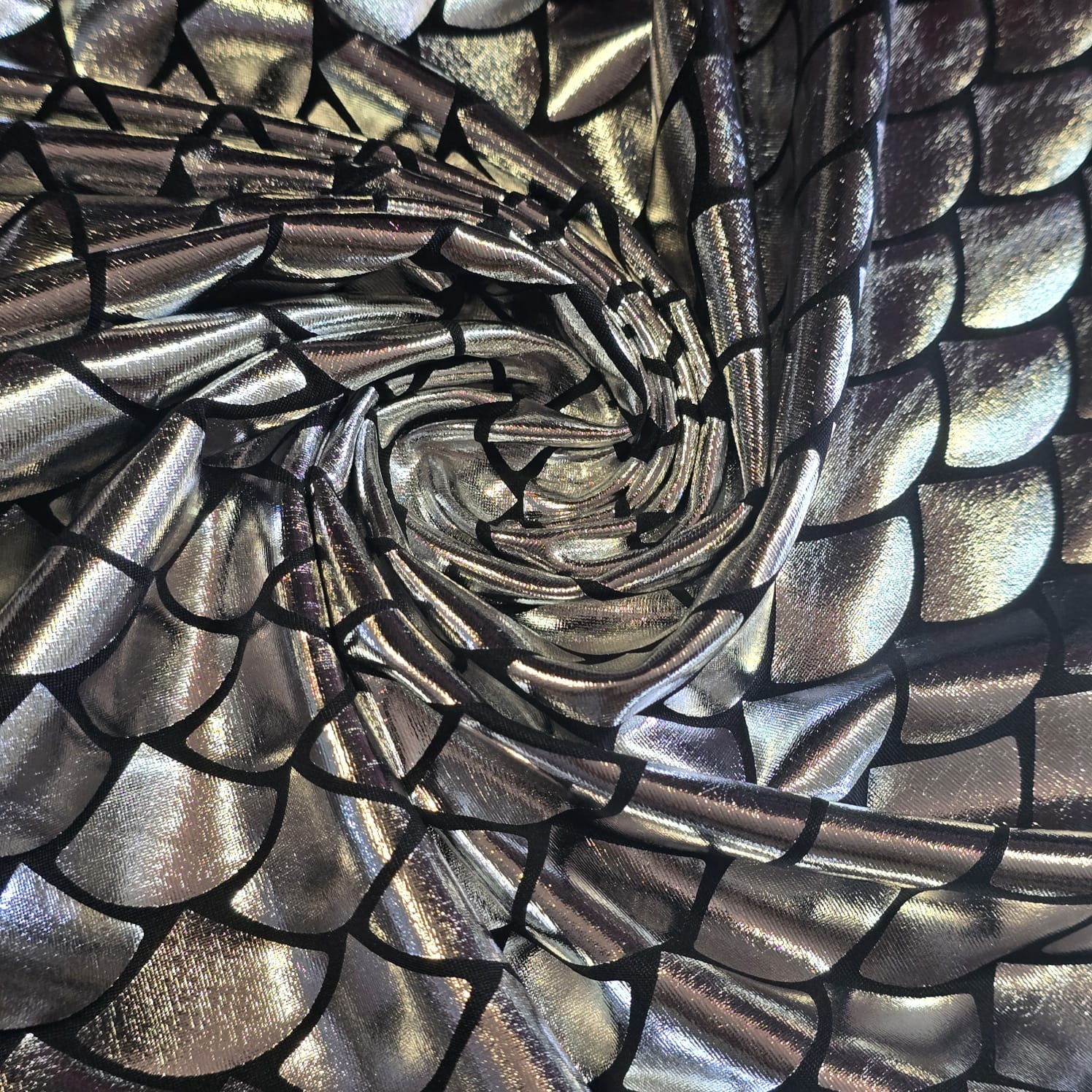 Metallic Mermaid Scale ITY Stretch Fabric. This fabric features a beautiful foil reptile / mermaid scale pattern that reflects light with vibrant colours including blue, purple, silver, pink and teal.