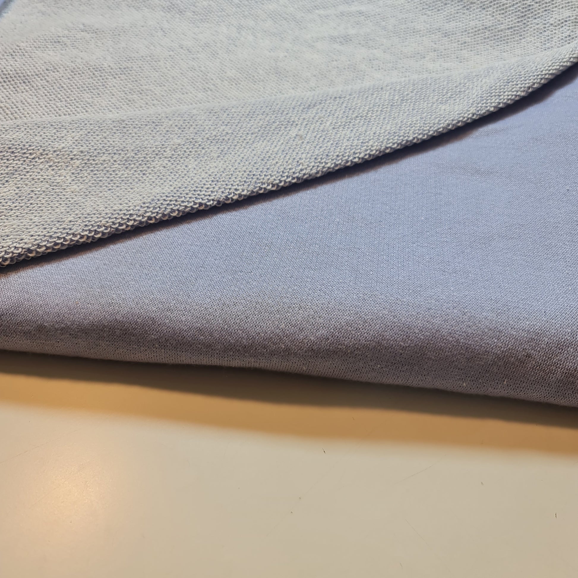 Sky Loop Back Viscose Jersey Fabric. Featuring a smooth jersey face with a loop-back reverse in a calming sky-blue shade, this fabric is perfect for dressmaking, loungewear, tops, costumes, and craft projects.