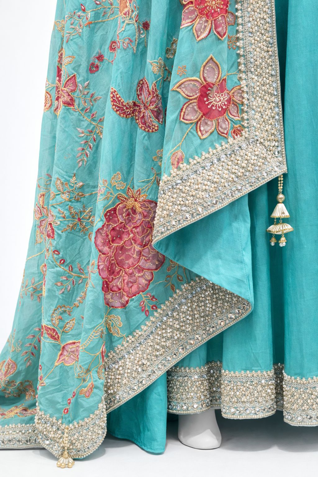 The gown flows gracefully with a wide flare and is finished with an intricately hand-embellished hemline adorned with pearls, mirror work, and fine detailing that adds a luxurious touch.