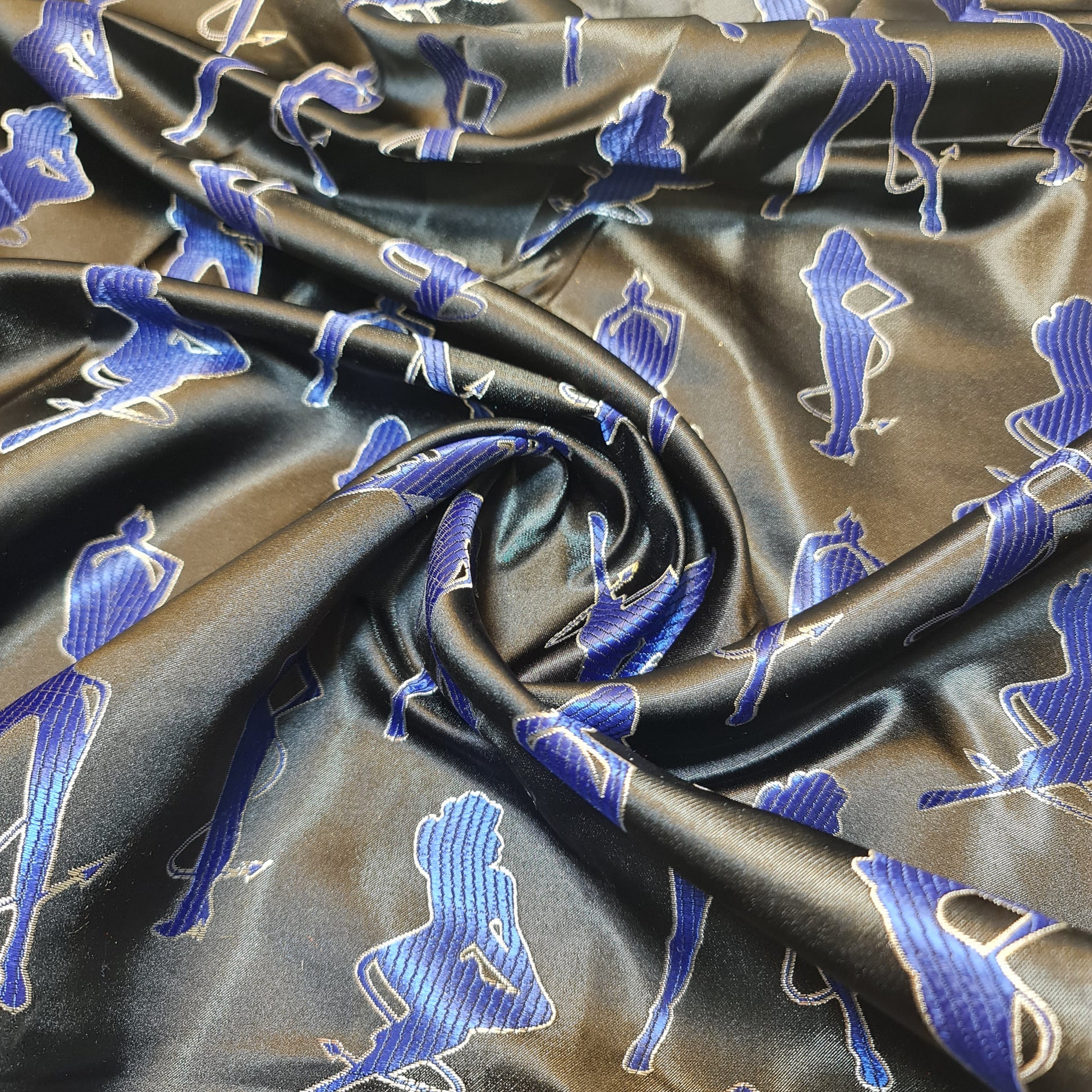 Premium black satin jacquard fabric, perfect for club dancers, costumes, dresses, and creative sewing projects. The fabric features a luxurious satin finish with intricate jacquard patterns, offering both shine and texture for eye-catching outfits.