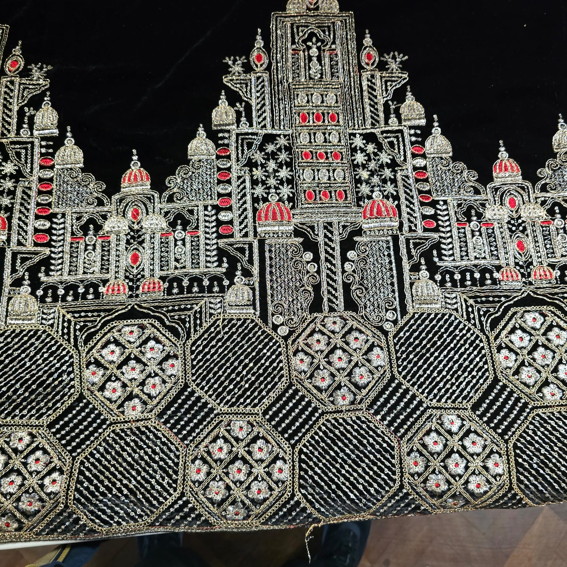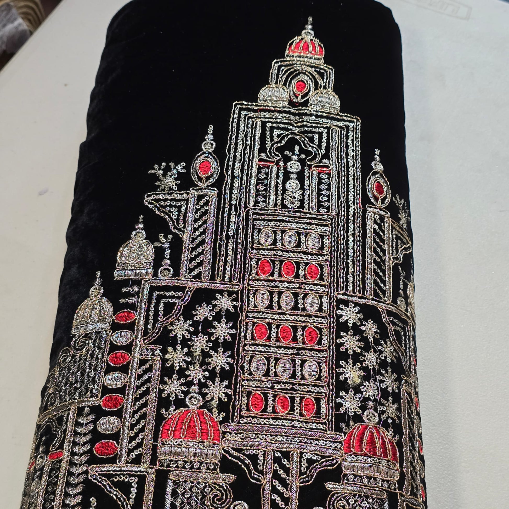 This luxurious deep Black velvet is beautifully adorned with intricate gold zari-style embroidery forming an elegant royal palace design with detailed domes and architectural motifs. Accented with subtle red thread highlights, this fabric offers a rich, regal appearance perfect for high-end fashion and décor.