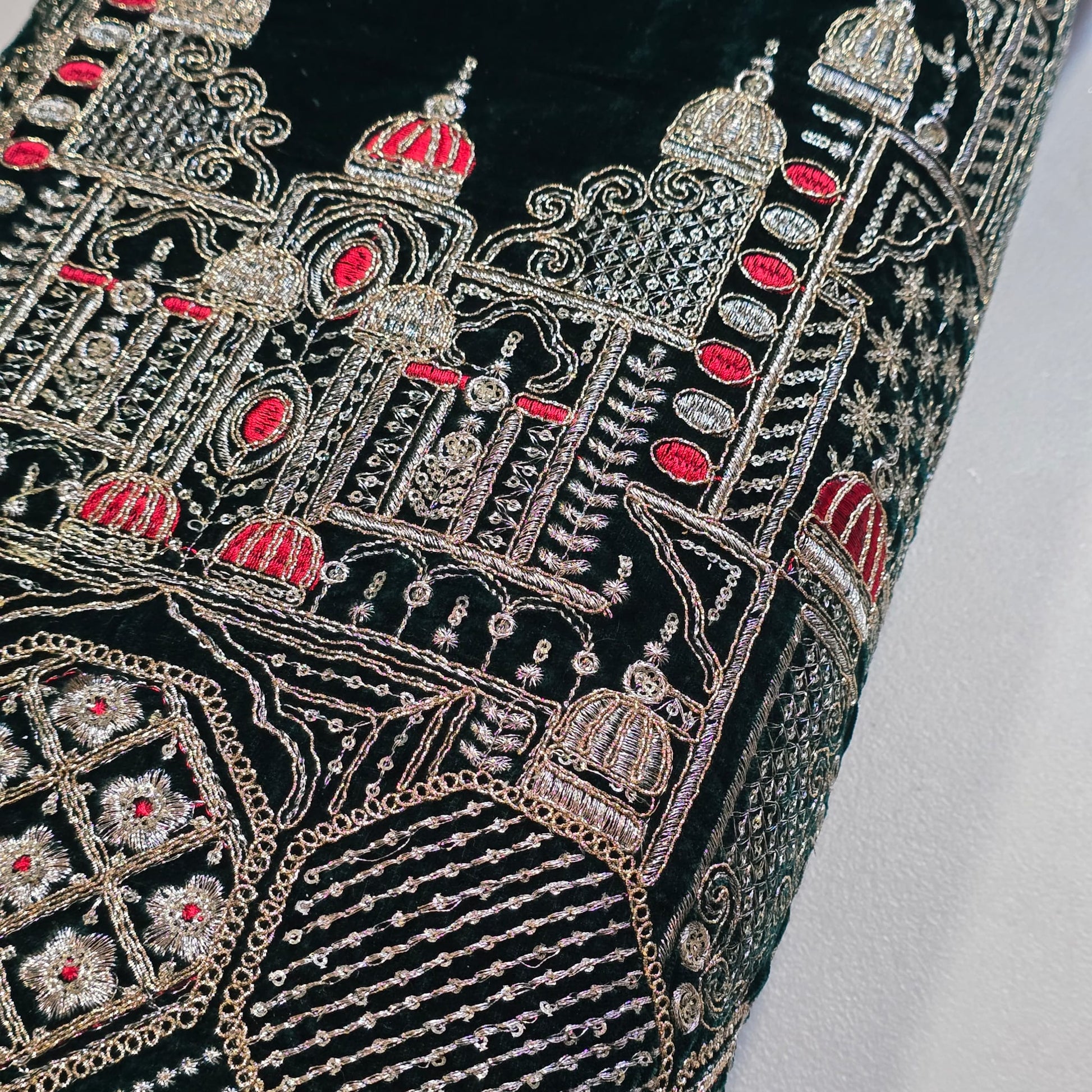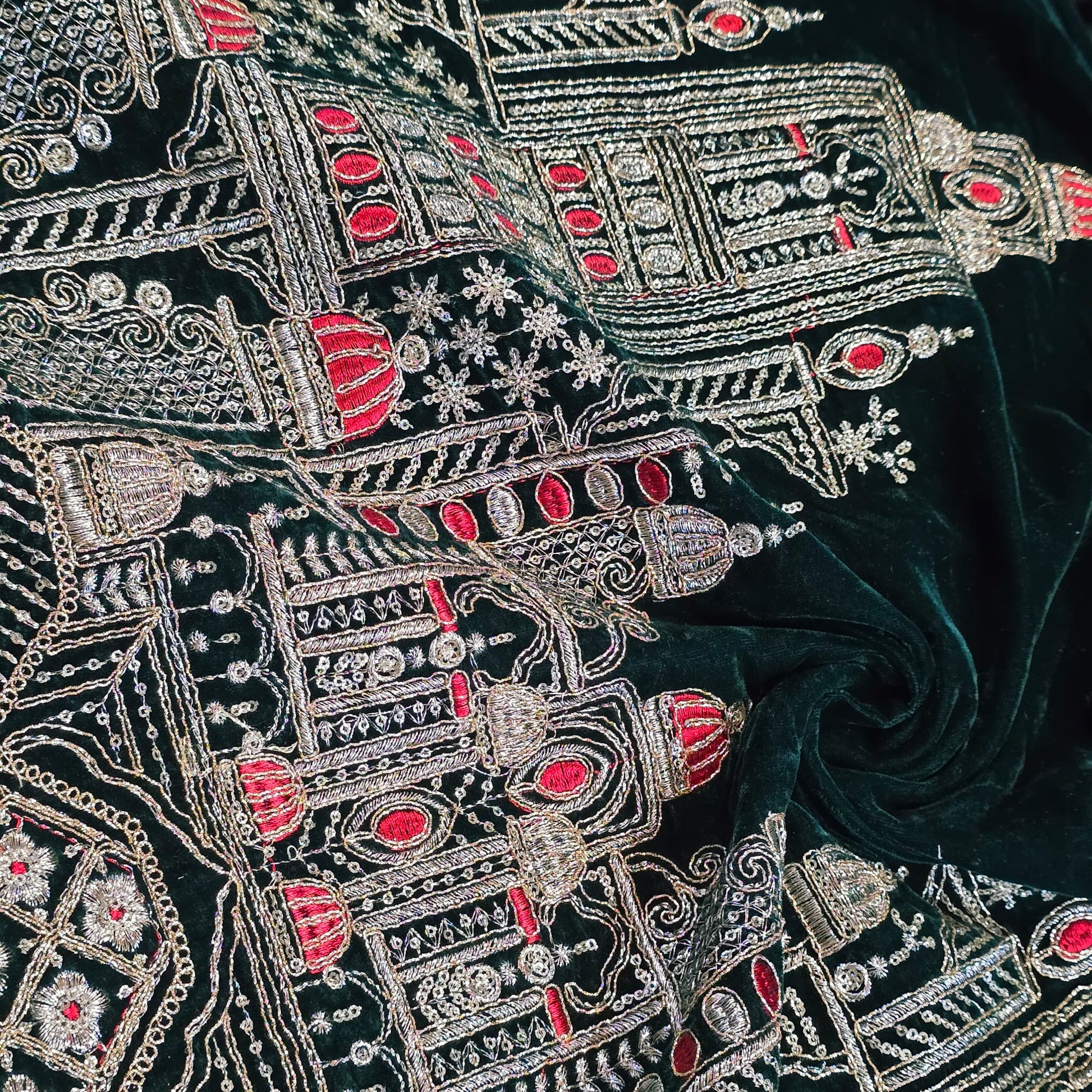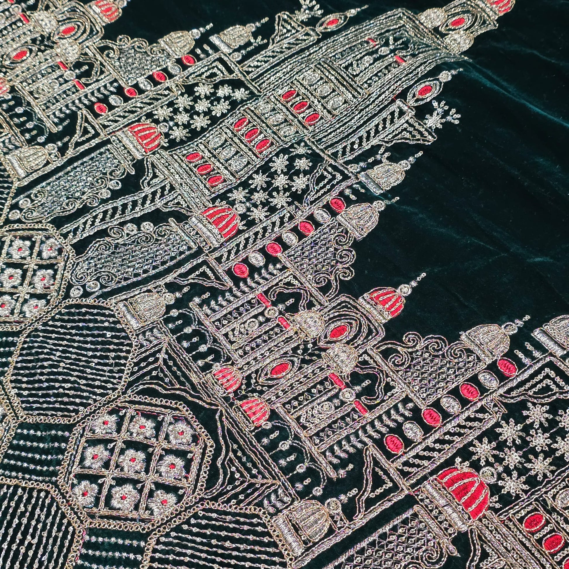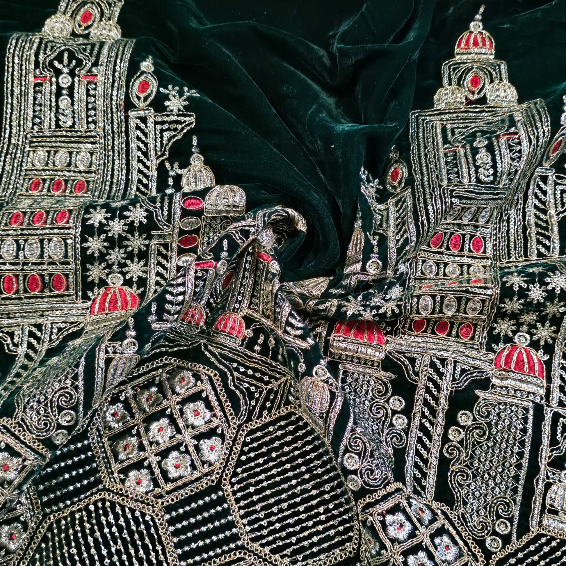 This luxurious deep Bottle Green velvet is beautifully adorned with intricate gold zari-style embroidery forming an elegant royal palace design with detailed domes and architectural motifs. Accented with subtle red thread highlights, this fabric offers a rich, regal appearance perfect for high-end fashion and décor.