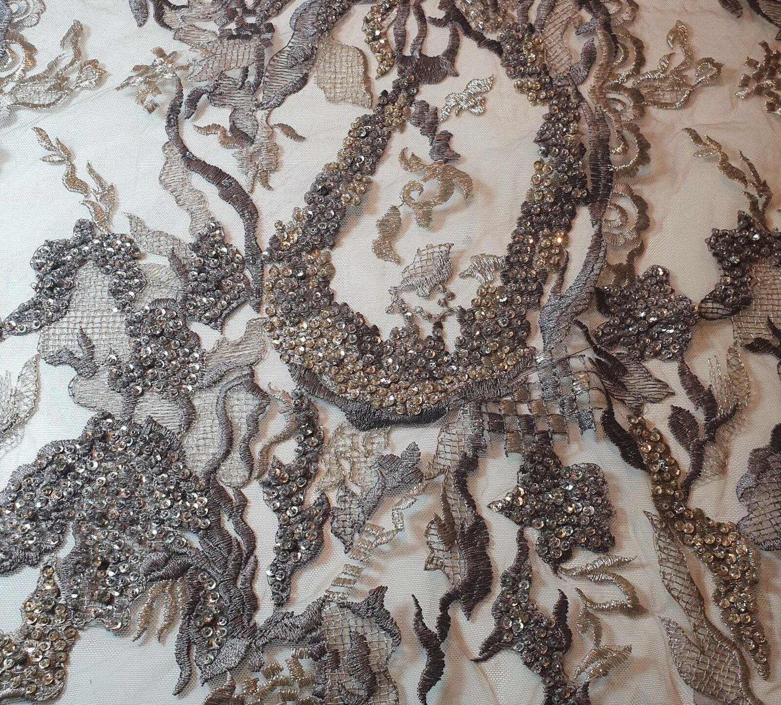 Marl Grey Premium Mesh Net Material Floral Diamante Embroidery Dress Craft Fabric 58" By The Meter