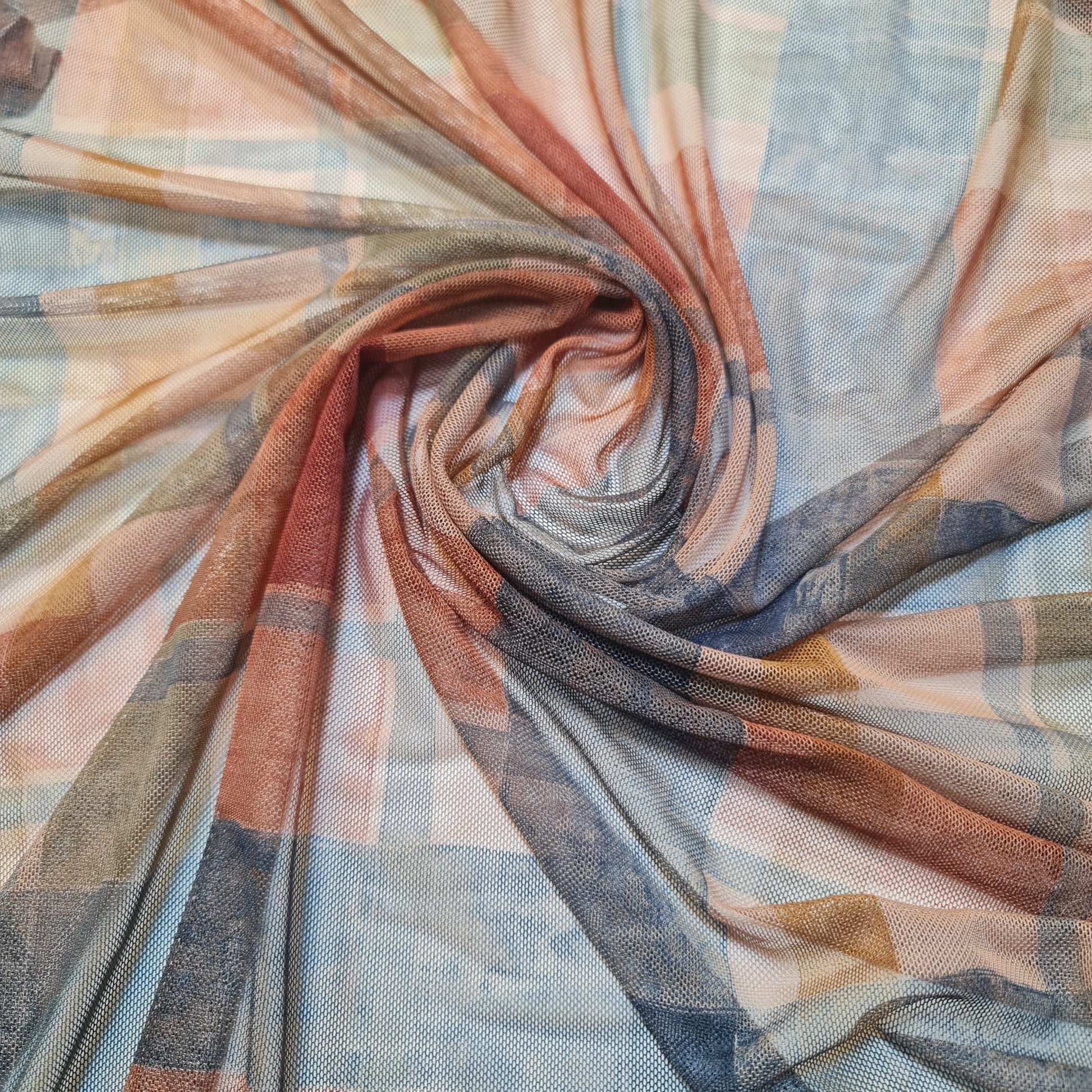 Power mesh net 4-way stretch fabric, featuring a soft, breathable mesh with excellent flexibility and recovery. The fabric showcases a unique multicolour plaid pattern in earthy tones, adding a stylish touch to lingerie, dancewear, activewear, cosplay, and layering garments. Its semi-sheer texture provides lightweight support, making it perfect for lining, shaping, and creative fashion projects. Durable, comfortable, and versatile, this power mesh is ideal for both functional and decorative uses.