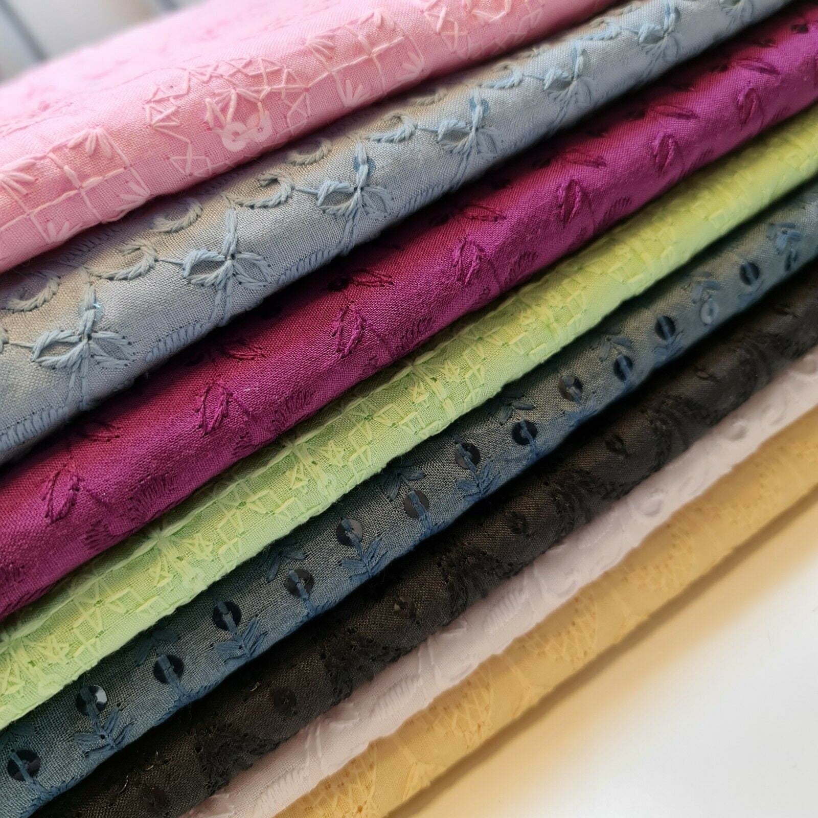 Elevate your sewing projects with this 100% cotton lawn Broderie Anglaise fabric, featuring exquisite Schiffli embroidery for a timeless and elegant look. Lightweight, breathable, and soft to the touch, this fabric is perfect for creating stylish garments and delicate craft projects.