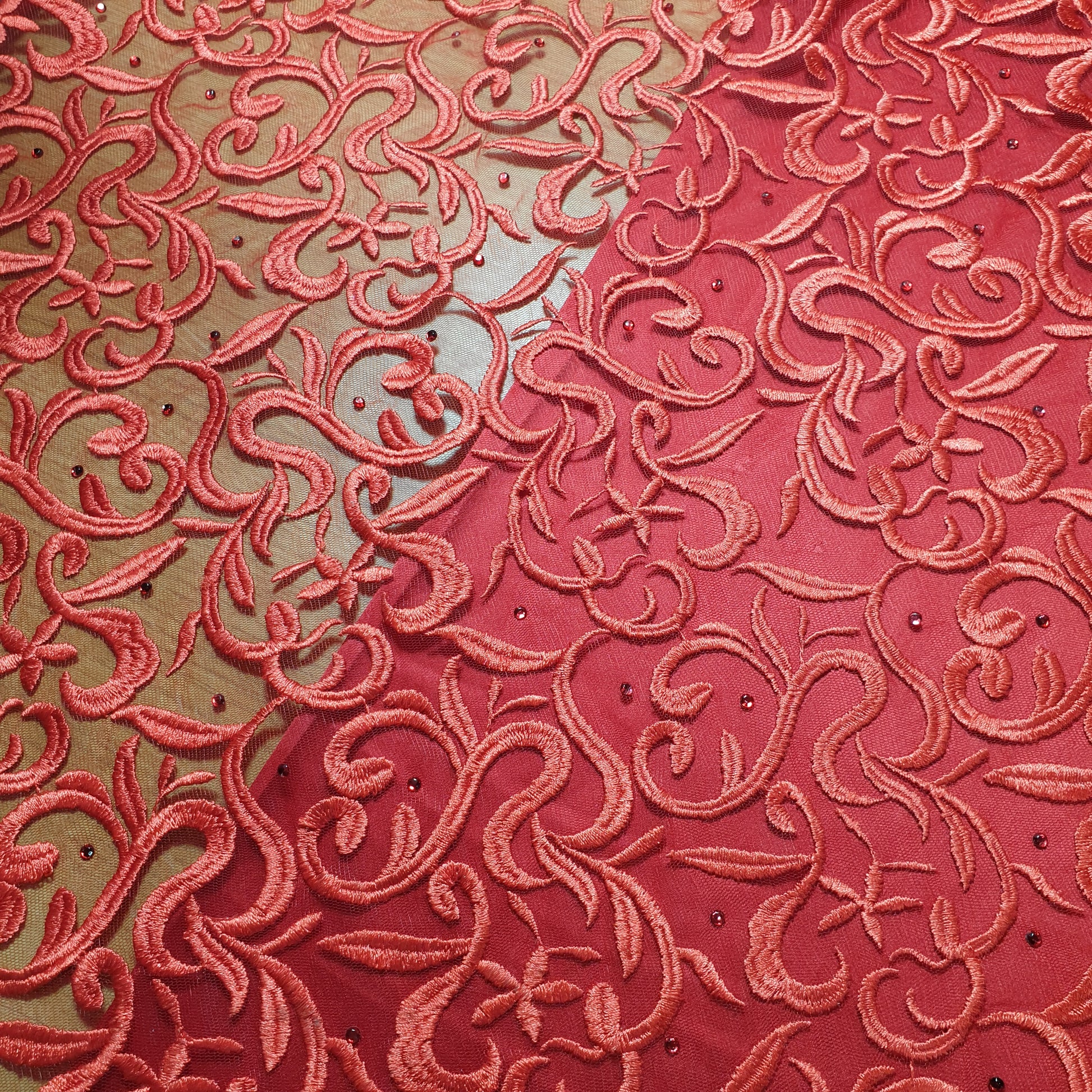 Red Premium Mesh Net Material Floral Diamante Embroidery Dress Craft Fabric 58" By The Meter