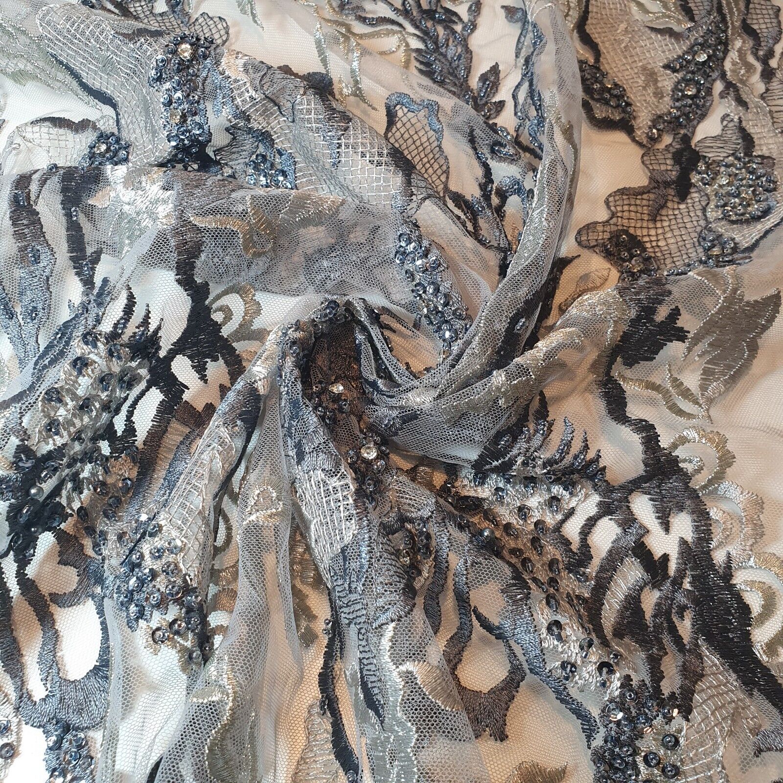 SILVER GREY Premium Mesh Net Material Floral Diamante Embroidery Dress Craft Fabric 58" By Meter