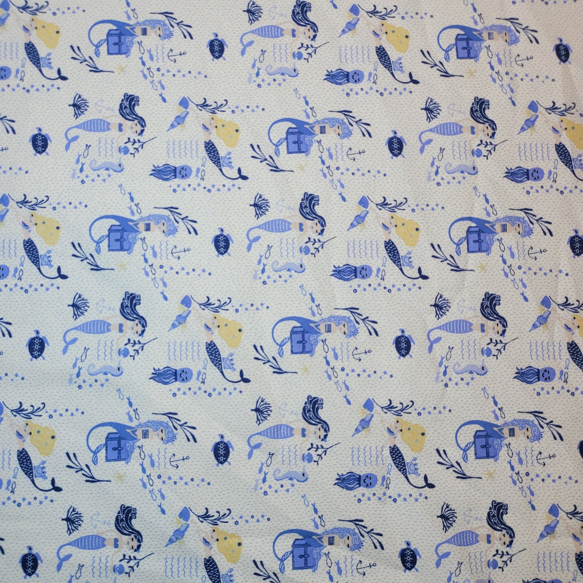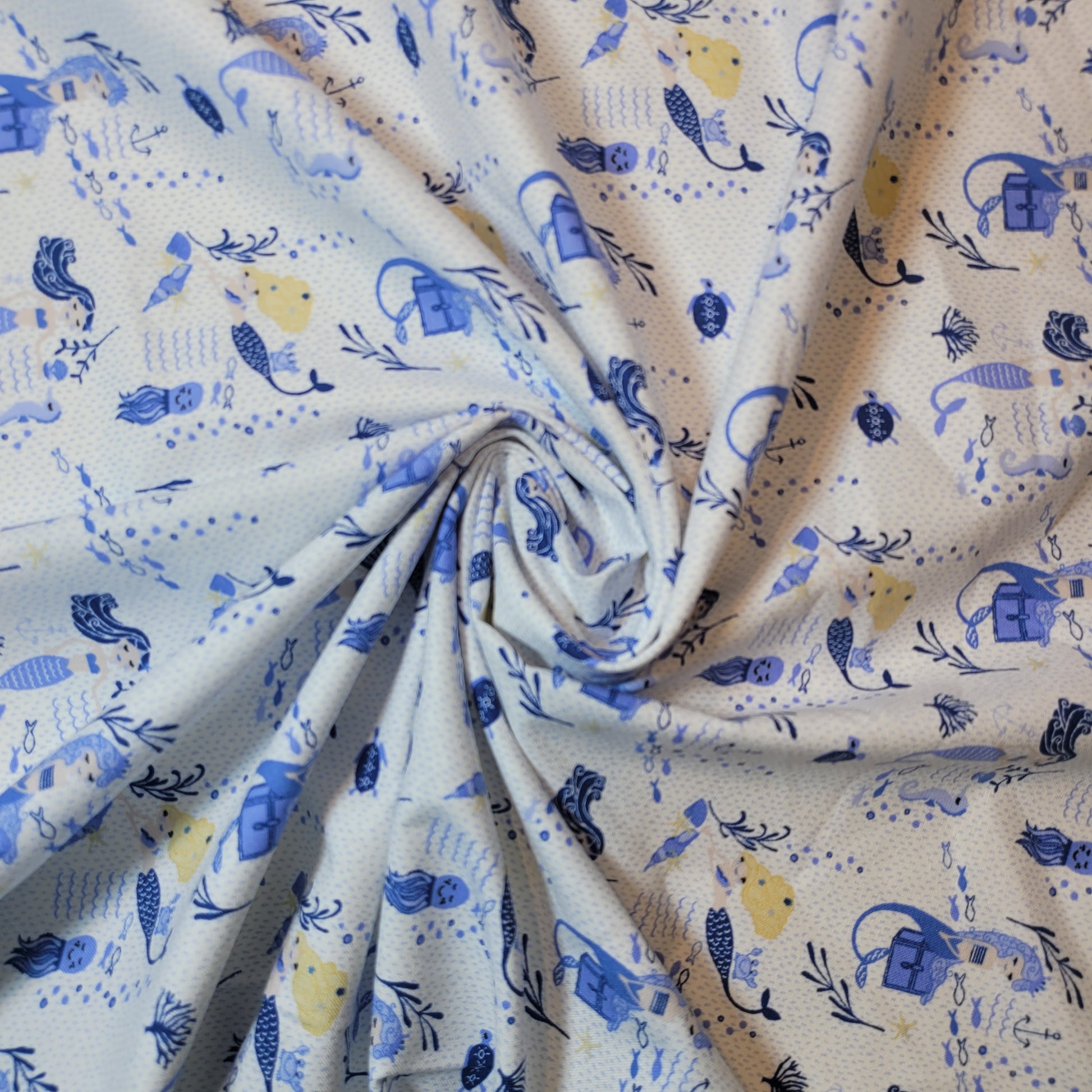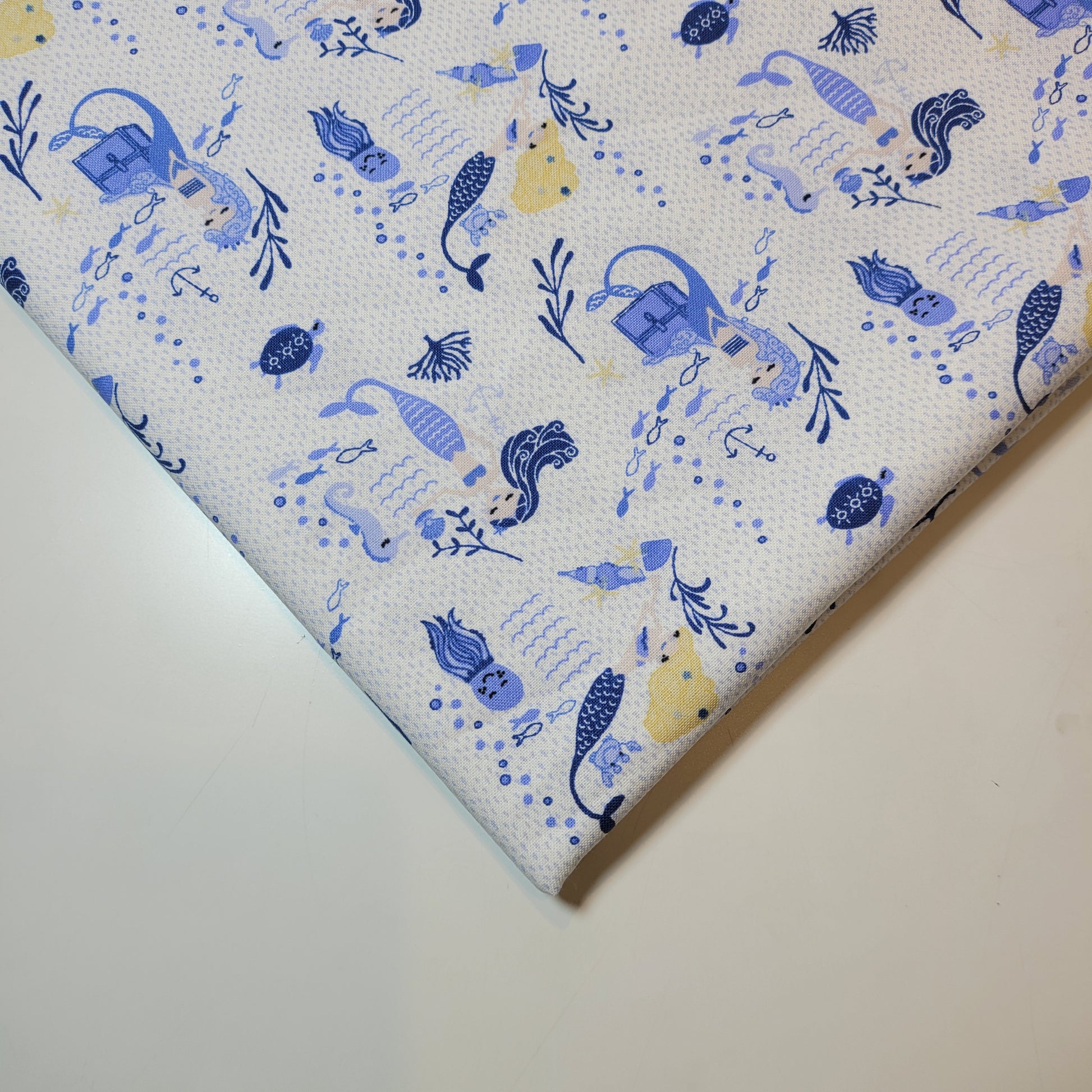 Soft 100% Cotton Floral Fabric for Kids’ Sewing and Quilting – 44" Wide, Perfect for Dresses and Crafts (Blue & White Mermaids)